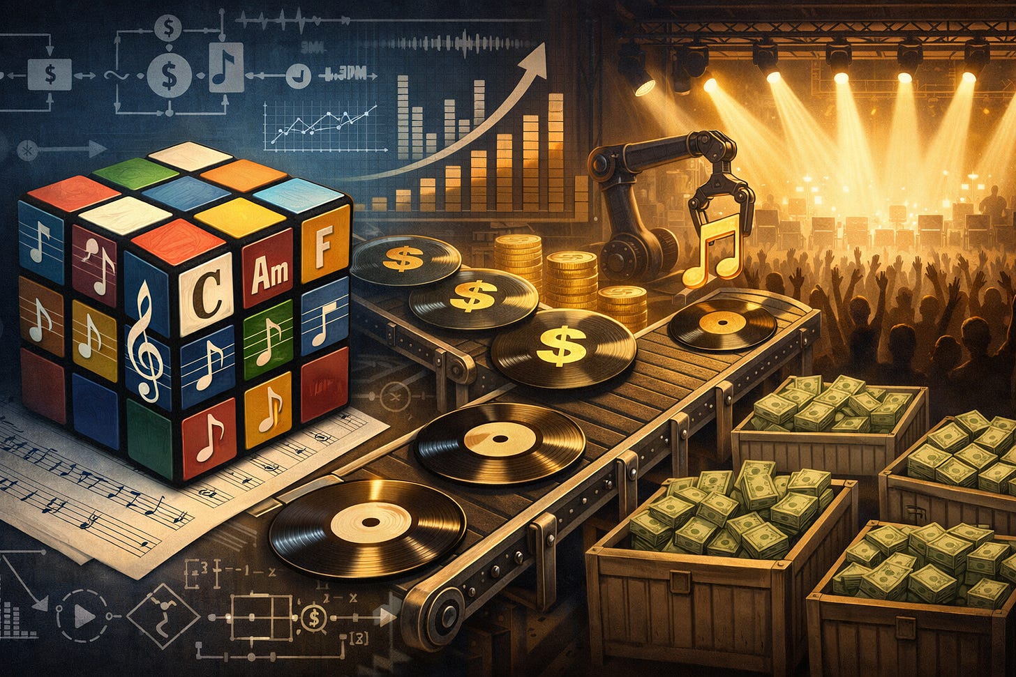 Certain kinds of music, in outre parlance, have become solved problems. That means there’s a finite solution set, it’s well-established territory. We already knew the same chord progressions get recycled — like those savants solving Rubik’s Cubes, mainstream music became a commoditized optimization problem of maximizing the biggest revenue from the shortest streamable hits. Which sounds precisely like what machines are for.